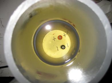 View looking down into the grey PVC tube at the banana connectors