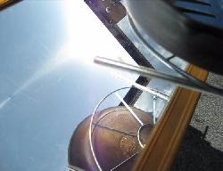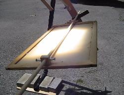 The mirror is an ordinary mirror that someone thew out years ago and that I cut to the length I figured I'd need. On the right below I flipped the mirror on its back so you can see that the mirror is not at the focal point. It's only part way and that's why the mirror doesn't get hot enough to crack from temperature gradients.