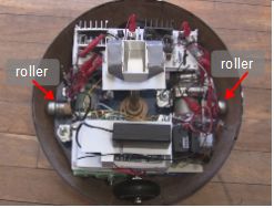 In the photo below is the drive system in the bottom half of the ball for testing while I was finallizing the circuit. Note that the rollers are attached to the two ends of the drive plate below but weren't attached yet at the time the above photos were taken. (They're the small brass colored objects at the uppermost end and lowermost end, just touching the inside of the ball.) There's more about the rollers at the bottom of this page.