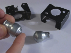 The same could not easily be done with rollerblade wheels though. If the rollerblade wheel was tightened to the axle, the inner part of the wheel would stay with the axle but the outer tire of the wheel would spin freely on its bearing. To fix the tire part firmly to the axle and have it turn only when the axle turned, I made what I called wheel locks using some aluminum bar that I'd cut and drilled into the shapes shown below. A screw was then put through one of the holes in the wheel lock and screwed into a part of the tire that conveniently already had a hole. Once fully assembled, this would fix the tire relative to the lock and the axle.