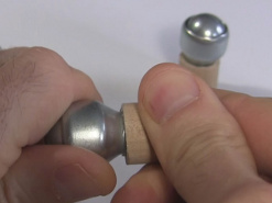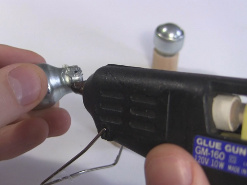 Notice that the rollers each have a narrow stem. I drilled holes in two pieces of dowel for this stem to fit into and hot glued them into the dowels. Ideally the dowel should have a diameter that is the same or larger than the larger diameter part of the rollers.