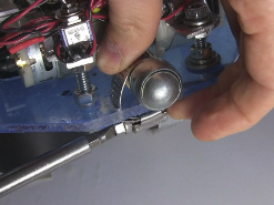To mount the roller on the plate, two slots were cut out of the plate at either end by melting the plate using an old soldering iron. Then a hose clamp was pushed through the slots and tightened around the roller, holding the roller firmly in place. By loosening the hose clamp it's easy to move the roller in and out to adjust its distance to the ball.