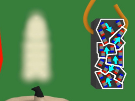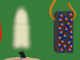 4. In the diagram below, the magnet is the blue and red object on the left. The white lines represent the magnetic field of that magnet. Notice that when the piece of nickel is first put in the magnetic field it is not magnetized, its tiny magnets/atoms are not all aligned.