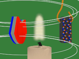 7. But there's a candle flame where the nickel has been attracted to. That flame heats up the nickel. Heat is defined as atoms or molecules moving randomly. The magnetic field resists this random motion. But eventually the temperature of the nickel reaches its Curie temperature/point (358C/676F) and the magnetic field loses the battle. The atoms start to move around randomly.