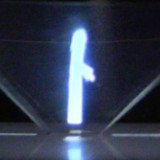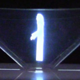 It's made by taping together four pieces of plastic to make a truncated pyramid as shown below. On a screen such as a phone, tablet or monitor, display an image or animation that consists of four different views of the same object. Sit the pyramid in the middle and when you look at it from the sides, you'll see the image closest to you projected onto the closest face of the pyramid. And since the pyramid is transparent the image will look like it's suspended in air.